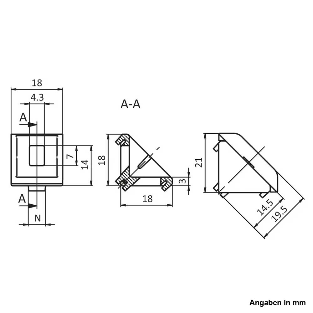 Zur rechtwinkligen stabilen Verbindung von Profilen und Flächenelementen; die offene Seite des Winkels kann durch die Abdeckkappe verschlossen werden.