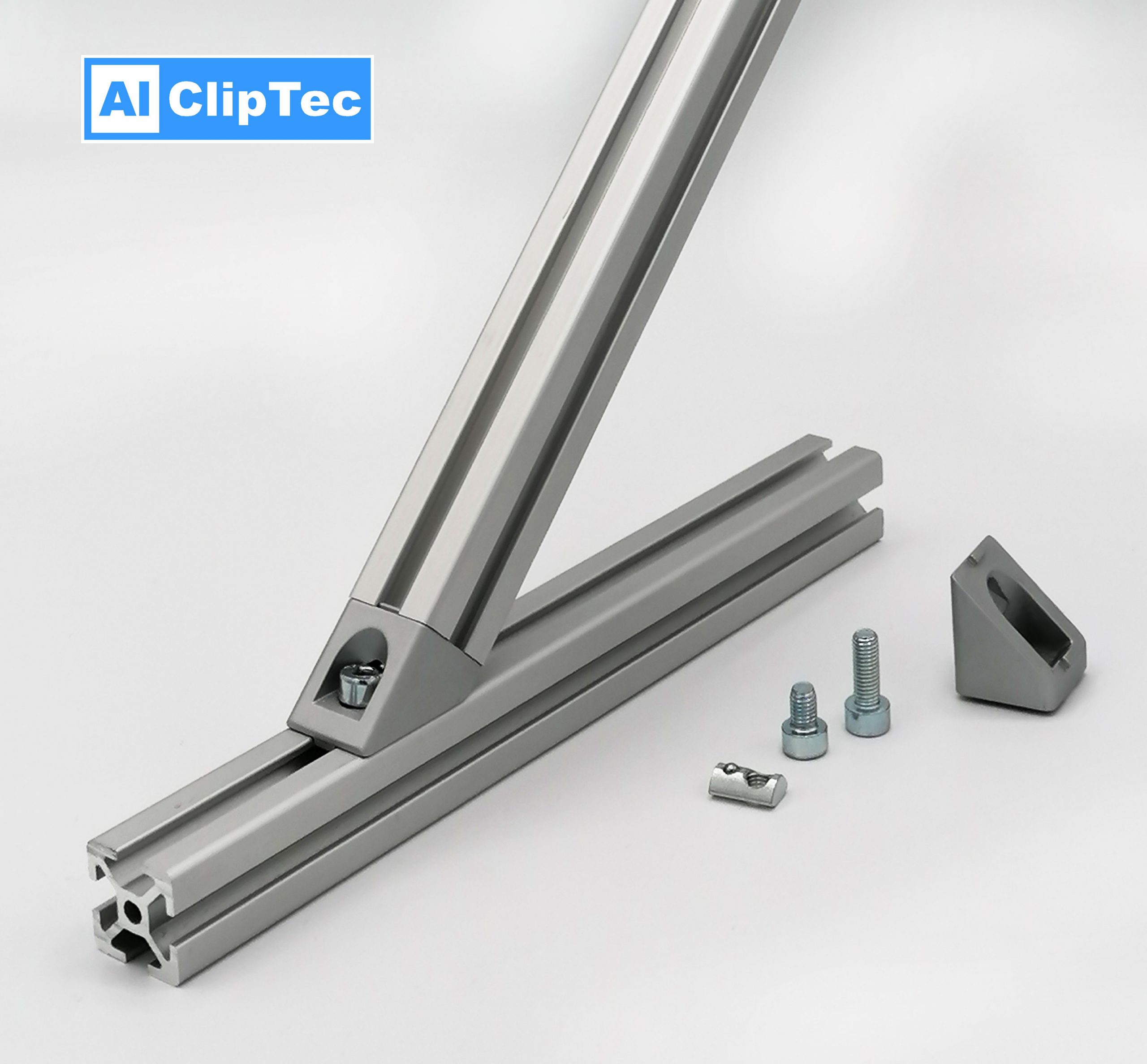 Der 45° Winkelverbinder 20×20 ist kompatibel mit den Profilen aus dem 20er Raster mit Nut 5 (20×10, 20×20, 20×40). Er eignet sich hervorragend für Stützstreben bei neuen und bestehenden Konstruktionen.