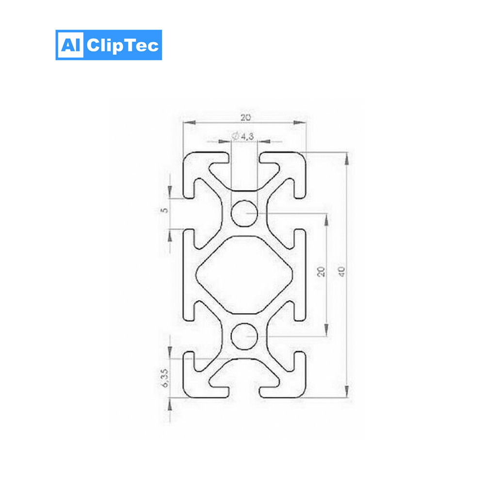 Aluprofil AlClipTec 20×40 Nut 5 – 0.1-6 m – I-Typ, hat 6 offene Nuten und ist somit ein vielseitiges, flexibles und leichtgewichtiges Konstruktionsprofil. Es ist für leichtere Konstruktionen wie z. B. Umhausungen gut geeignet. Umfangreiches, passendes Zubehör zu diesem Profil ist im Shop erhältlich.