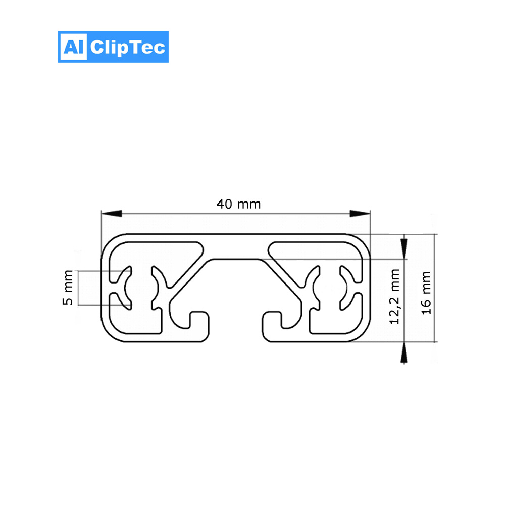 Aluprofil AlClipTec 40×16 SUPERLEICHT Nut 8 – 0.1-6 m – I-Typ besitzt einen flachen Querschnitt. Es ist ein sehr leichtgewichtiges und filigranes Profil und gut geeignet als Trag- und Halterungsprofil und für leichtere Projekte wie z. B. für Montageflächen, Vitrinen und Aufsteller.