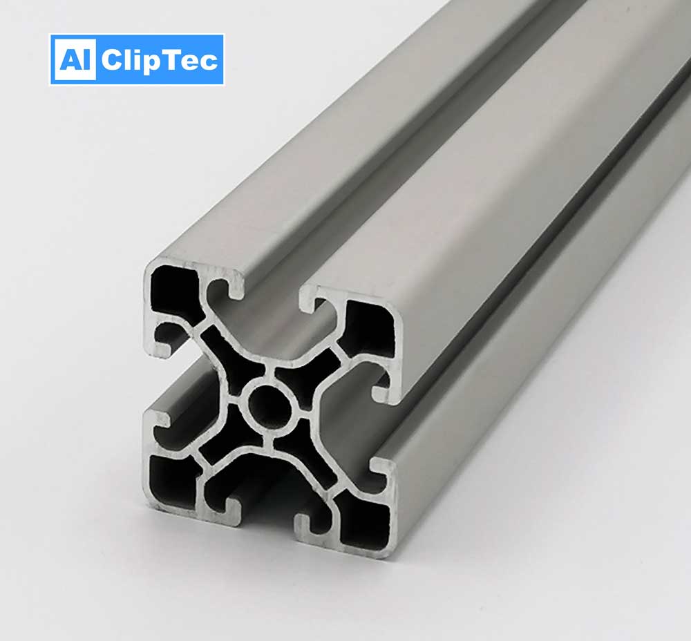 Aluprofil AlClipTec 40×40 SUPERLEICHT Nut 8 – 0.1-6 m – I-Typ, hat 4 offene Nuten. Es ist die leichtere Variante vom 40×40 Aluprofil und genauso vielseitig und flexibel einsetzbar. Dieses universelle Konstruktionsprofil ist bestens geeignet für belastungsoptimierte Projekte wie Vitrinen und Montageflächen. Umfangreiches, passendes Zubehör zu diesem Profil ist im Shop erhältlich.