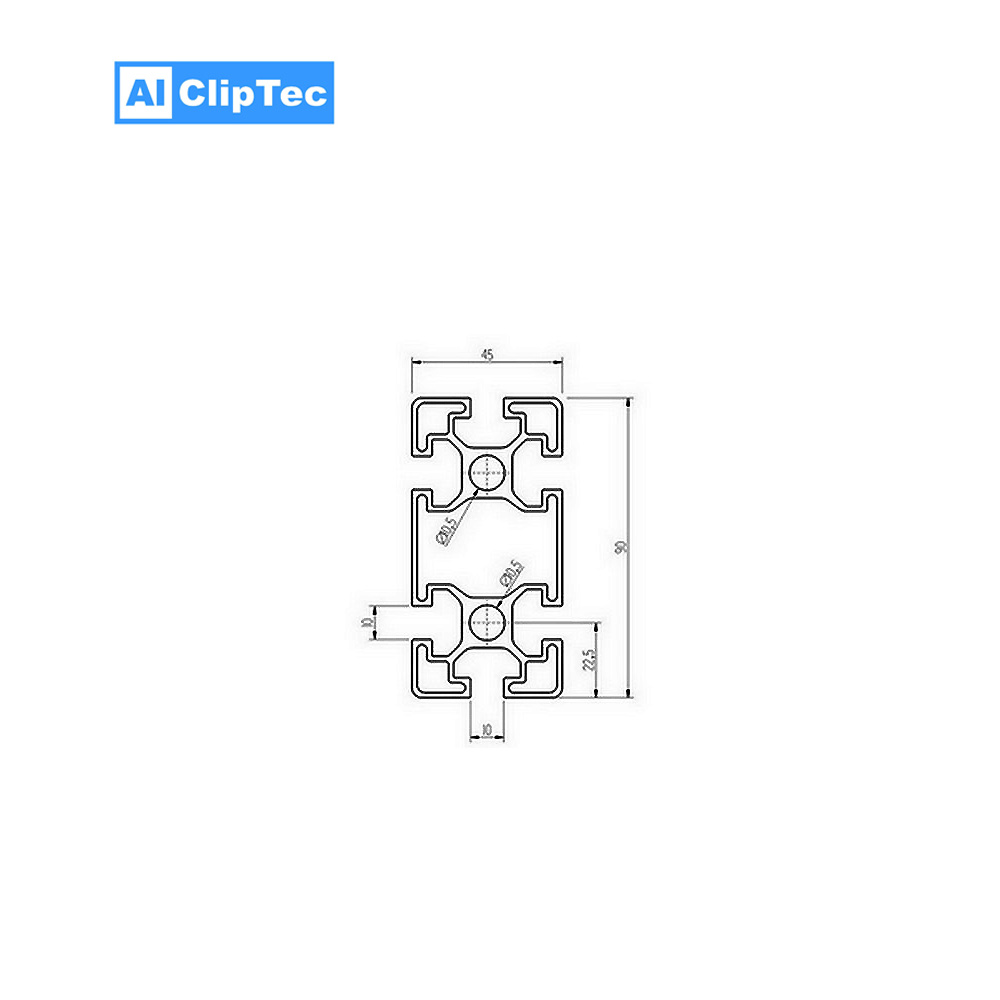 Aluprofil AlClipTec 45×90 Nut 10 – 0.1-6 m – B-Typ, hat 6 offene Nuten. Es ist ein sehr robustes, vielseitig und flexibel einsetzbares Konstruktionsprofil. Für stabile Projekte wie Maschinenumhausungen, Vitrinen und Montageflächen ist es bestens geeignet.