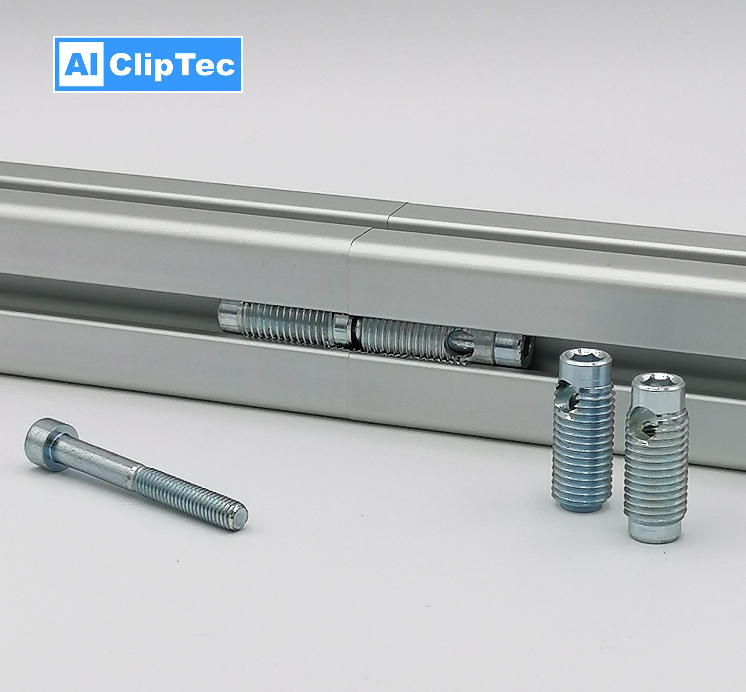Die Schneidhülsen werden in die gegenüberliegenden Nuten der zu verbindenden Profile geschraubt und anschließend mit der beiliegenden Schraube verbunden. Dabei führt man die Verbindungsschraube durch die Durchgangsschneidhülse und dreht diese dann in das Innengewinde der Befestigungsschneidhülse.