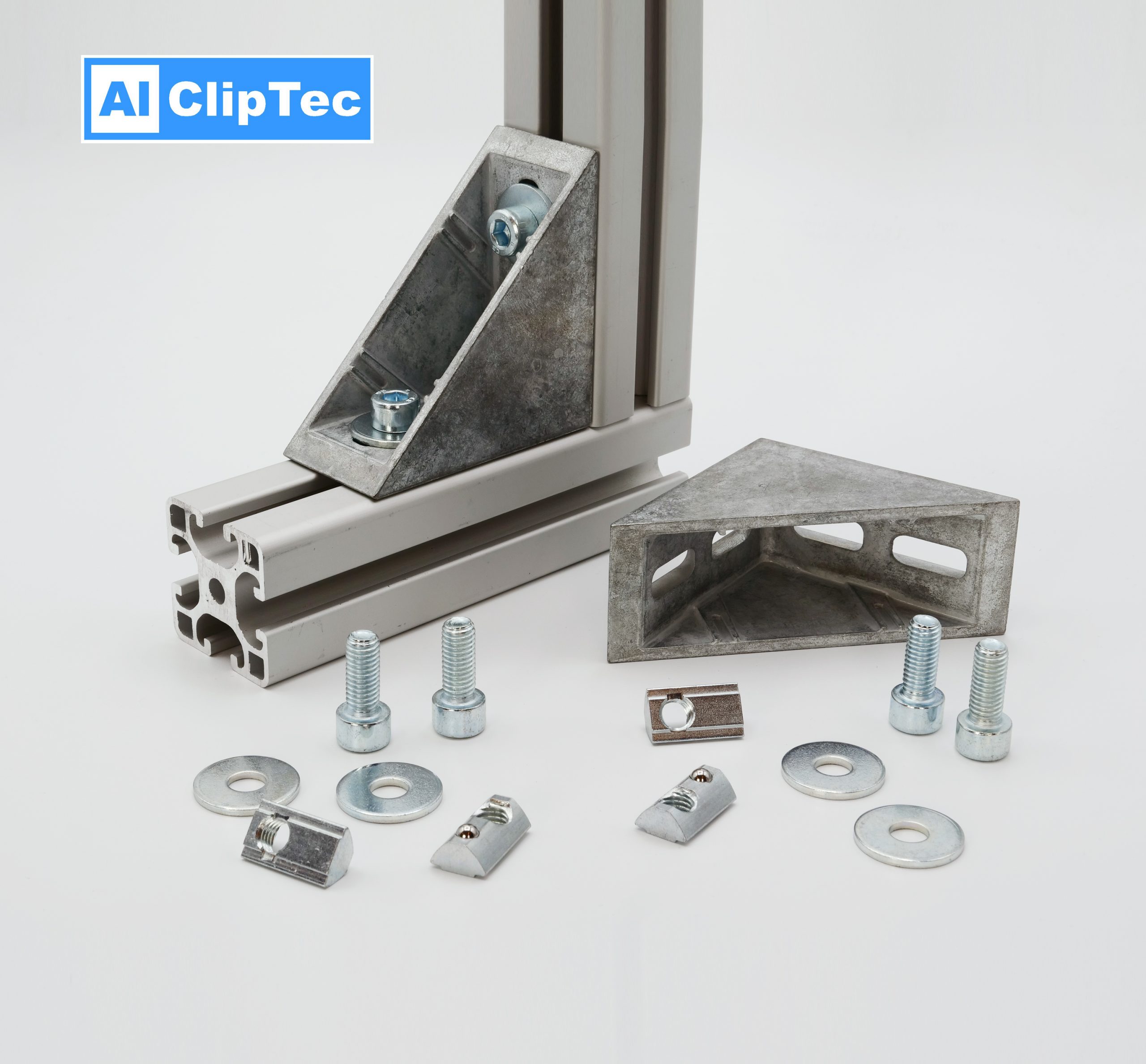 Set: 1 Winkel, 4 Schrauben, 4 Unterlegscheiben, 4 Nutensteine