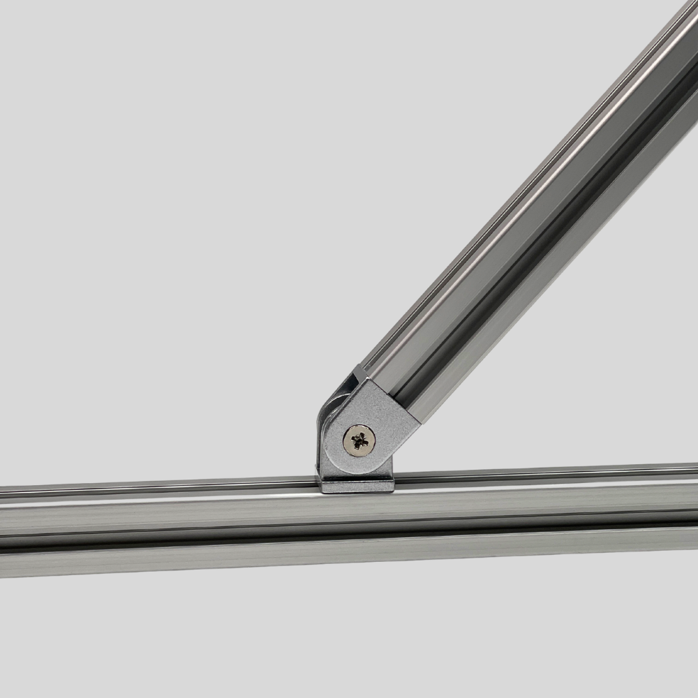 Zur beweglichen Verbindung von zwei Profilen. Mittels der Schrauben kann der Reibungswiderstand des Gelenkes stufenlos reguliert, bzw. das Gelenk in einer definierten Position fixiert werden. Es können verschiedene Anbringungsmöglichkeiten ausgewählt werden: Profilkern – Profilkern, Nut – Nut oder Profilkern – Nut