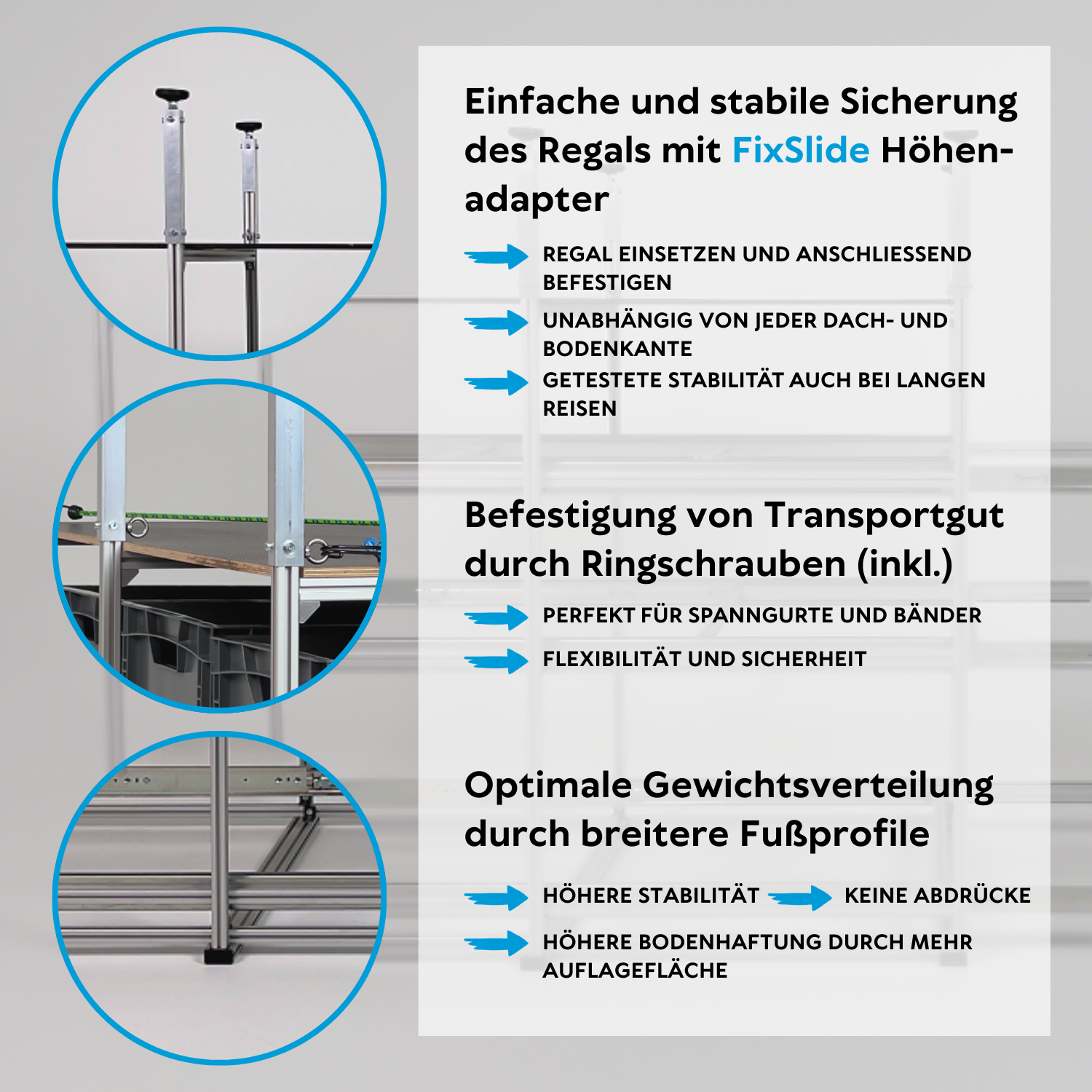 Mit unseren speziell entwickelten Fixslide Höhenadaptern lässt sich das Regal komfortabel außerhalb des Fahrzeugs vormontieren. Anschließend kann es problemlos in der Heckgarage eingesetzt und befestigt werden, ohne Schwierigkeiten mit der Garagenhöhe oder der Decken- und Bodenkante zu bekommen.