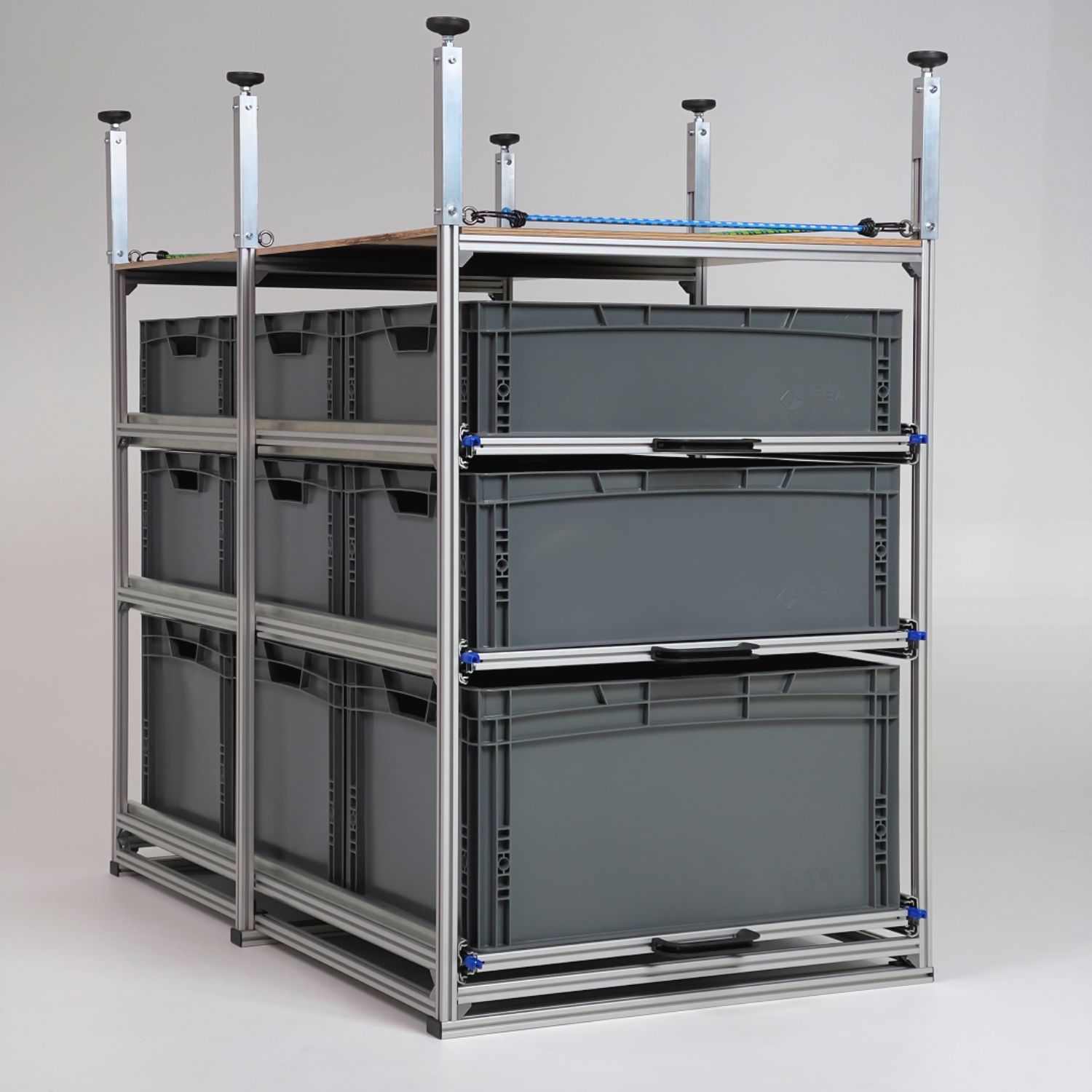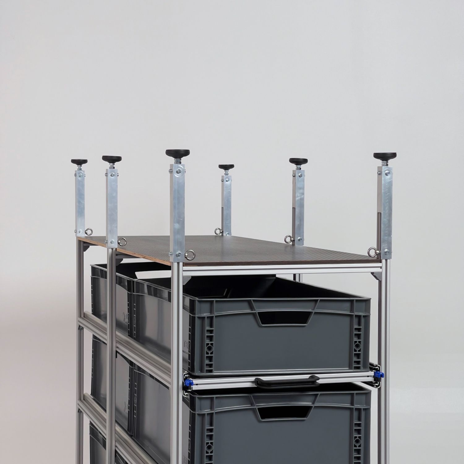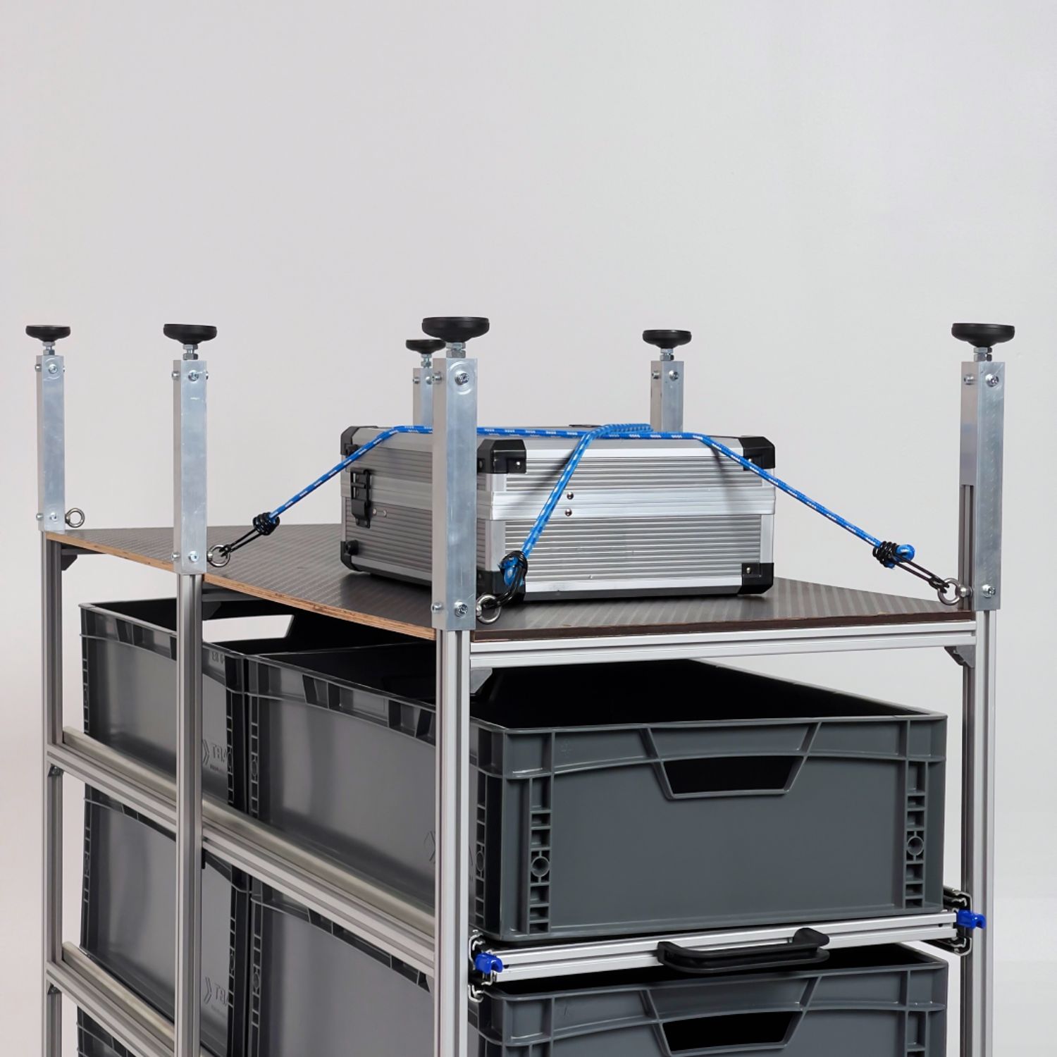 Die Ebenen sind mit hochwertigen Winkeln am Rahmen befestigt und kommen ohne feste Bohrungen aus. So lassen sie sich jederzeit flexibel an unterschiedliche Boxenhöhen oder neue Stauraumkonzepte anpassen.