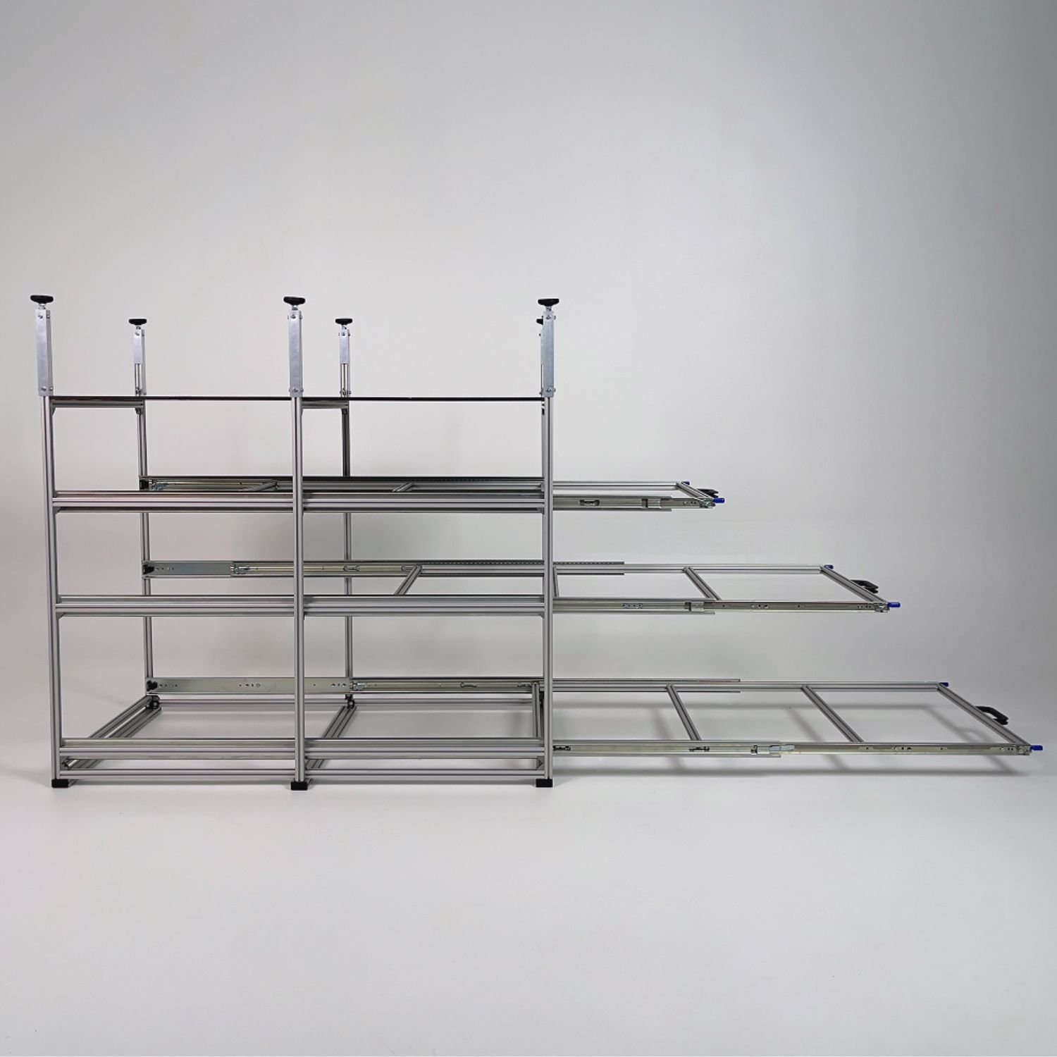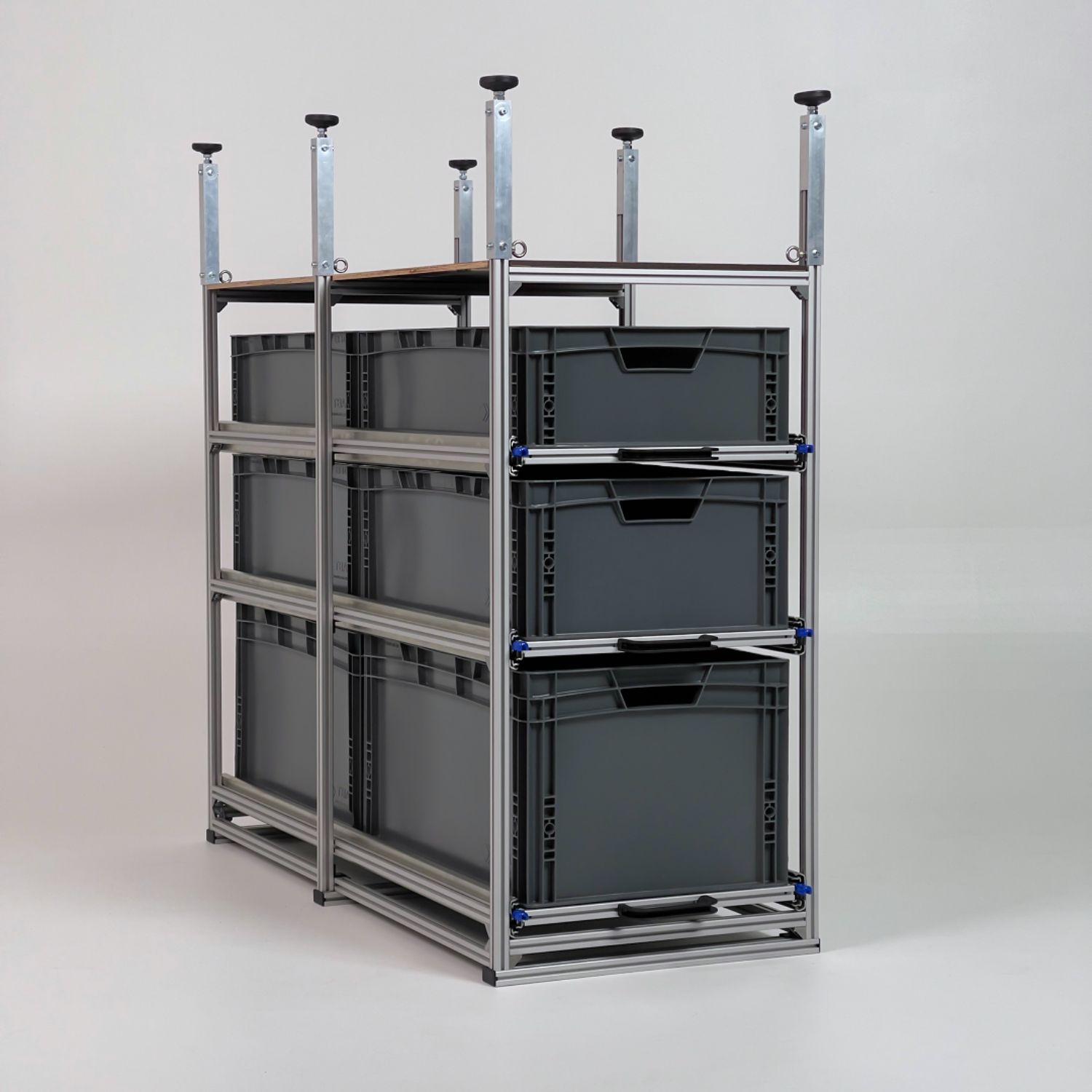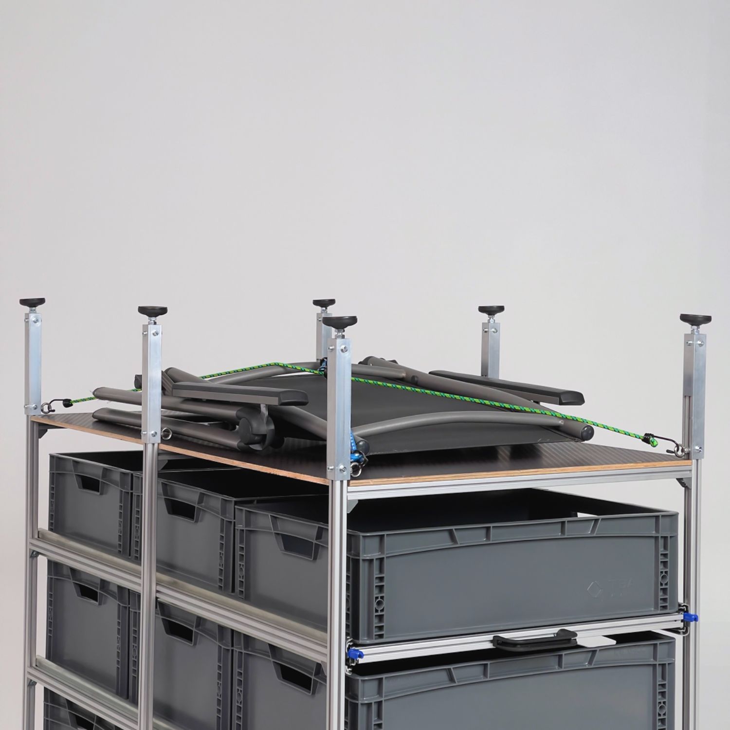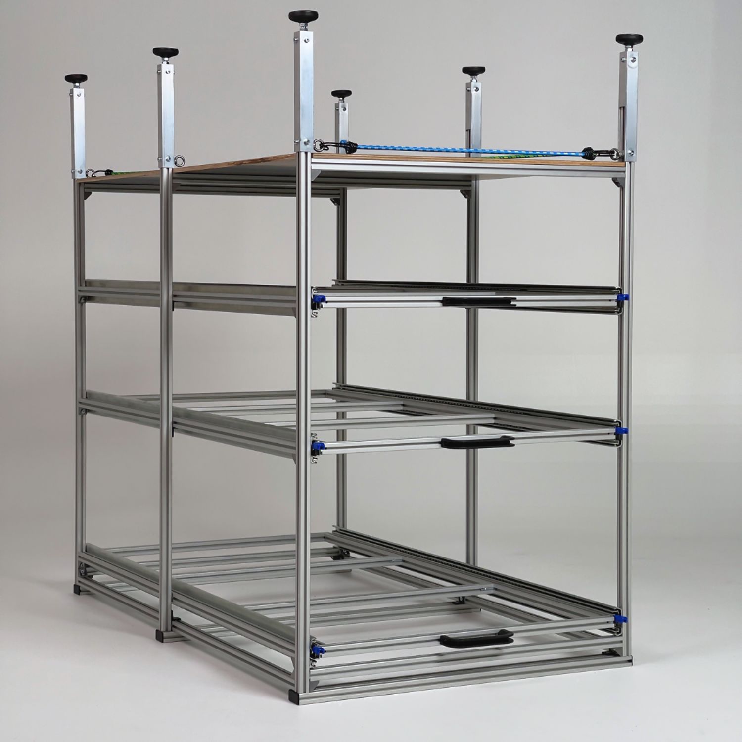 Die Ebenen sind mit hochwertigen Winkeln am Rahmen befestigt und kommen ohne feste Bohrungen aus. So lassen sie sich jederzeit flexibel an unterschiedliche Boxenhöhen oder neue Stauraumkonzepte anpassen.