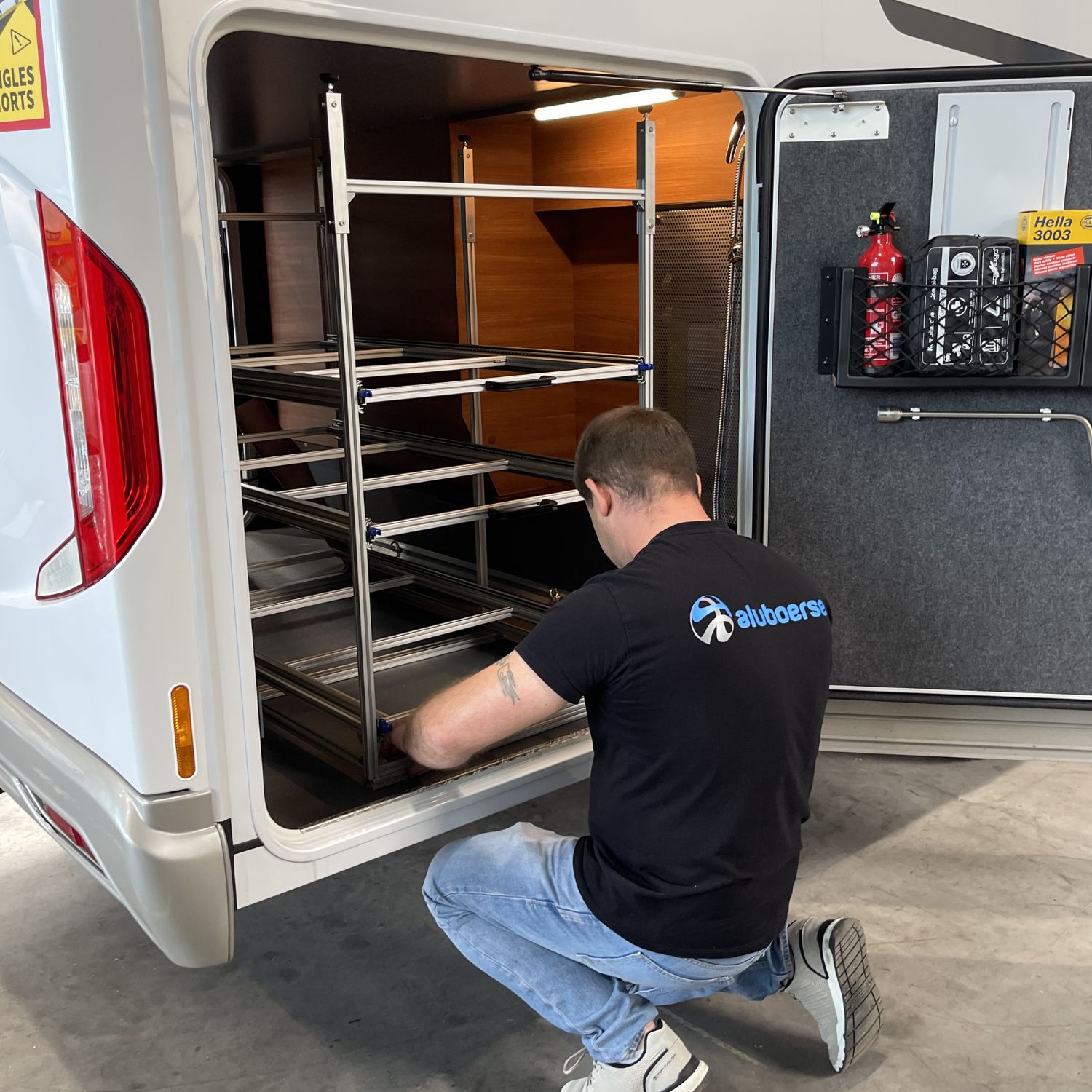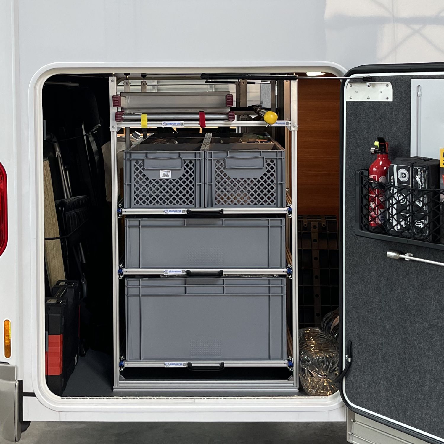 Der Heckauszug für Wohnmobil und Van aus unserer PRO Line wurde speziell für Camper entwickelt, die Ordnung und schnellen Zugriff in ihrer Heckgarage wollen. Das stabile Regalsystem ist für Euroboxen ausgelegt, über tausende Kilometer getestet und auf maximale Stabilität sowie flexible Anpassung optimiert.