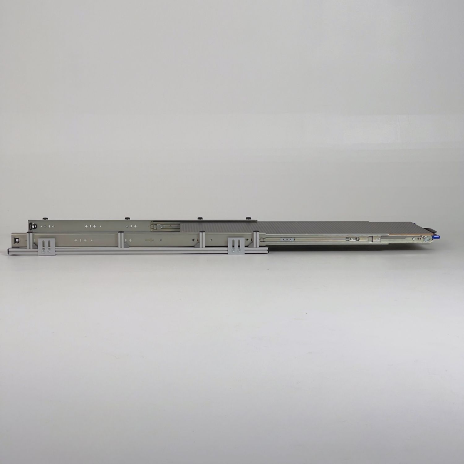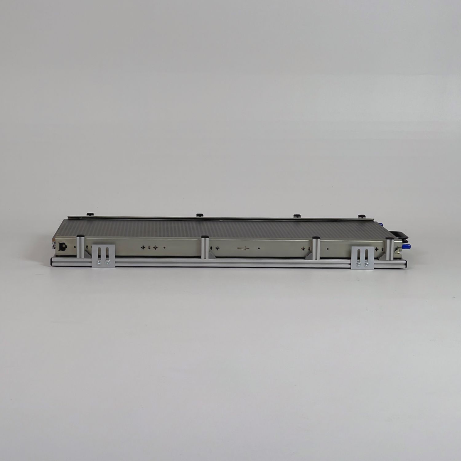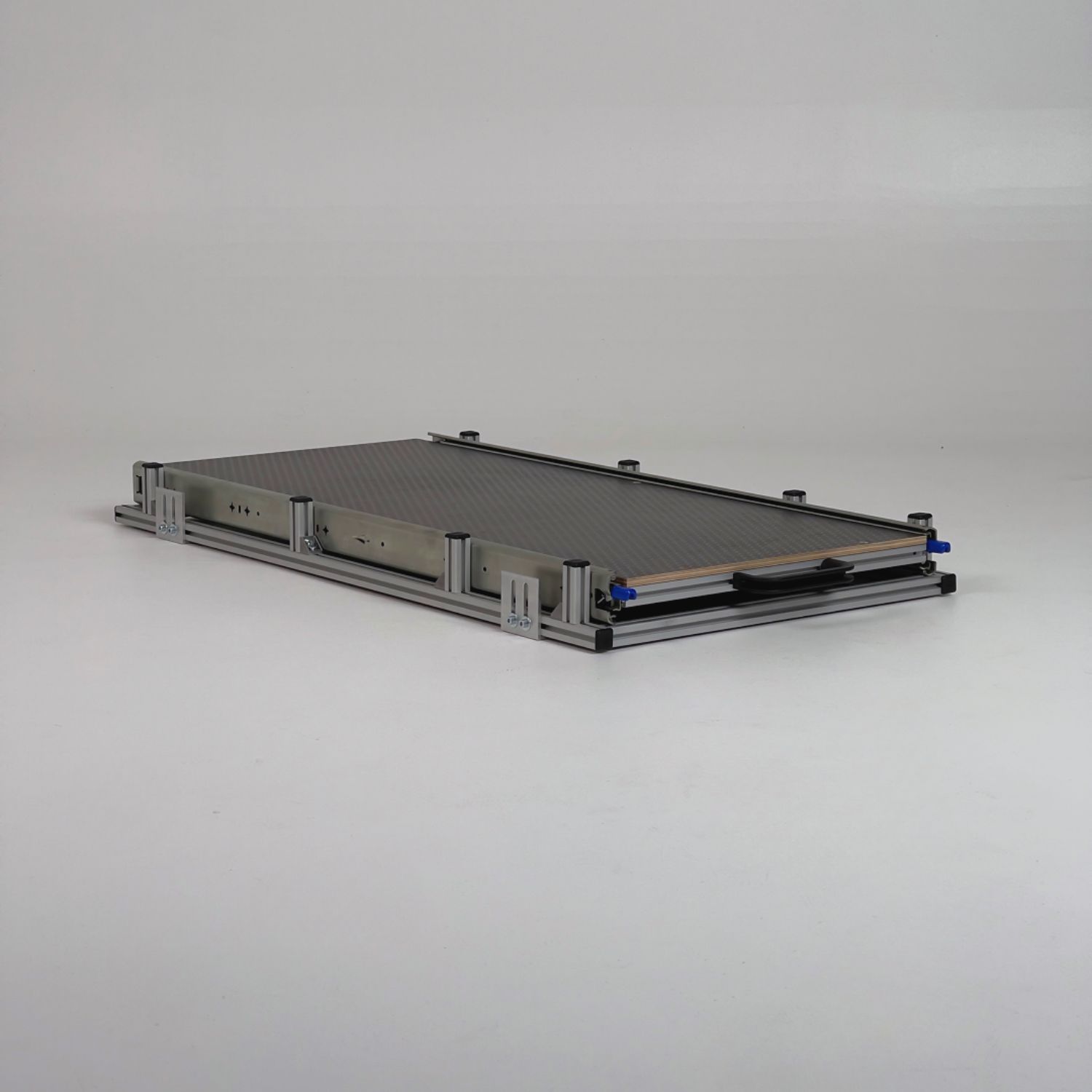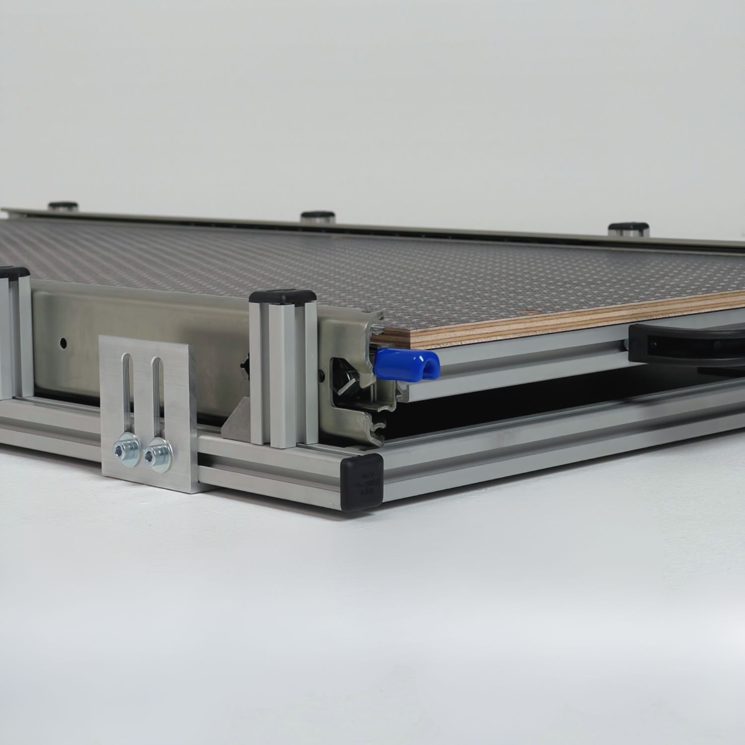 Gefertigt aus hochwertigen 20 × 20 mm Aluminium-Nutprofilen in silber eloxierter Ausführung, bietet der Heckauszug eine belastbare Auszugsebene mit einer Tragkraft von bis zu 100 kg. Die stabile 9 mm Siebdruck-Topplatte mit rutschhemmender Oberfläche sorgt für sicheren Halt und zusätzlichen Stauraum.