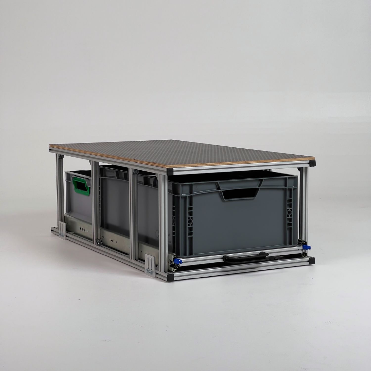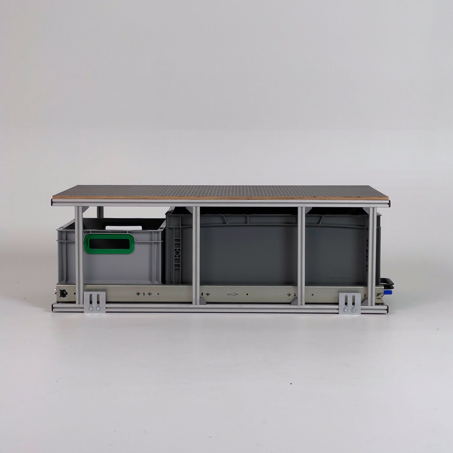 Wird die Topablage nicht benötigt, bleibt ein stabiler Rahmen bestehen, konstruiert nach den gängigen Eurobox-Maßen mit 400 mm Breite. So entsteht eine modulare und vielseitige Lösung für unterschiedlichste Anwendungen im mobilen Einsatz.
