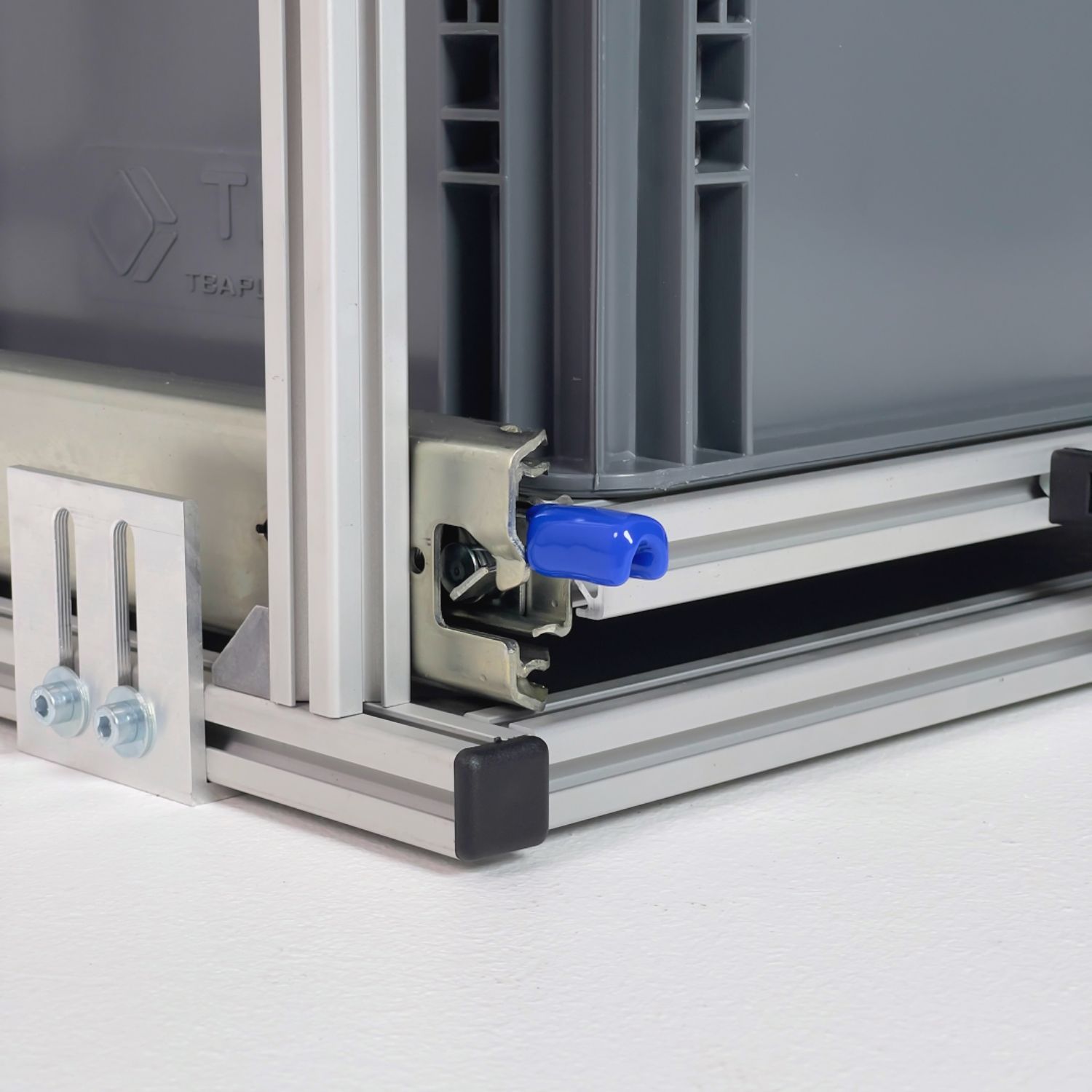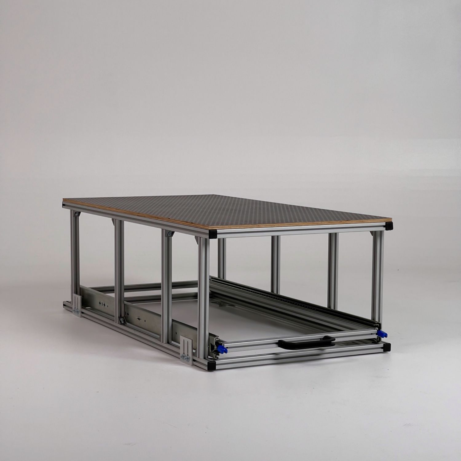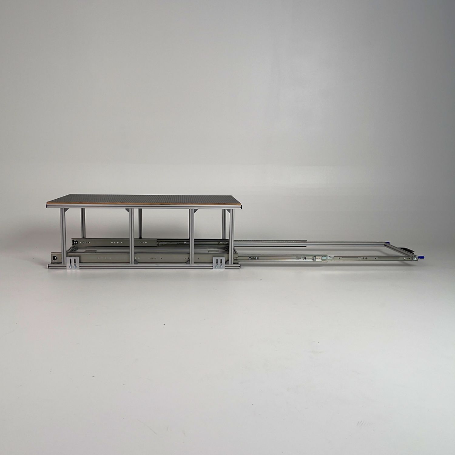 Gefertigt aus hochwertigen 20 × 20 mm Aluminium-Nutprofilen in silber eloxierter Ausführung bietet das System eine belastbare Auszugsebene mit einer Tragkraft von bis zu 100 kg. Die robuste 9 mm Siebdruck-Topablage mit rutschhemmender Oberfläche sorgt für sicheren Halt und zusätzlichen Stauraum.