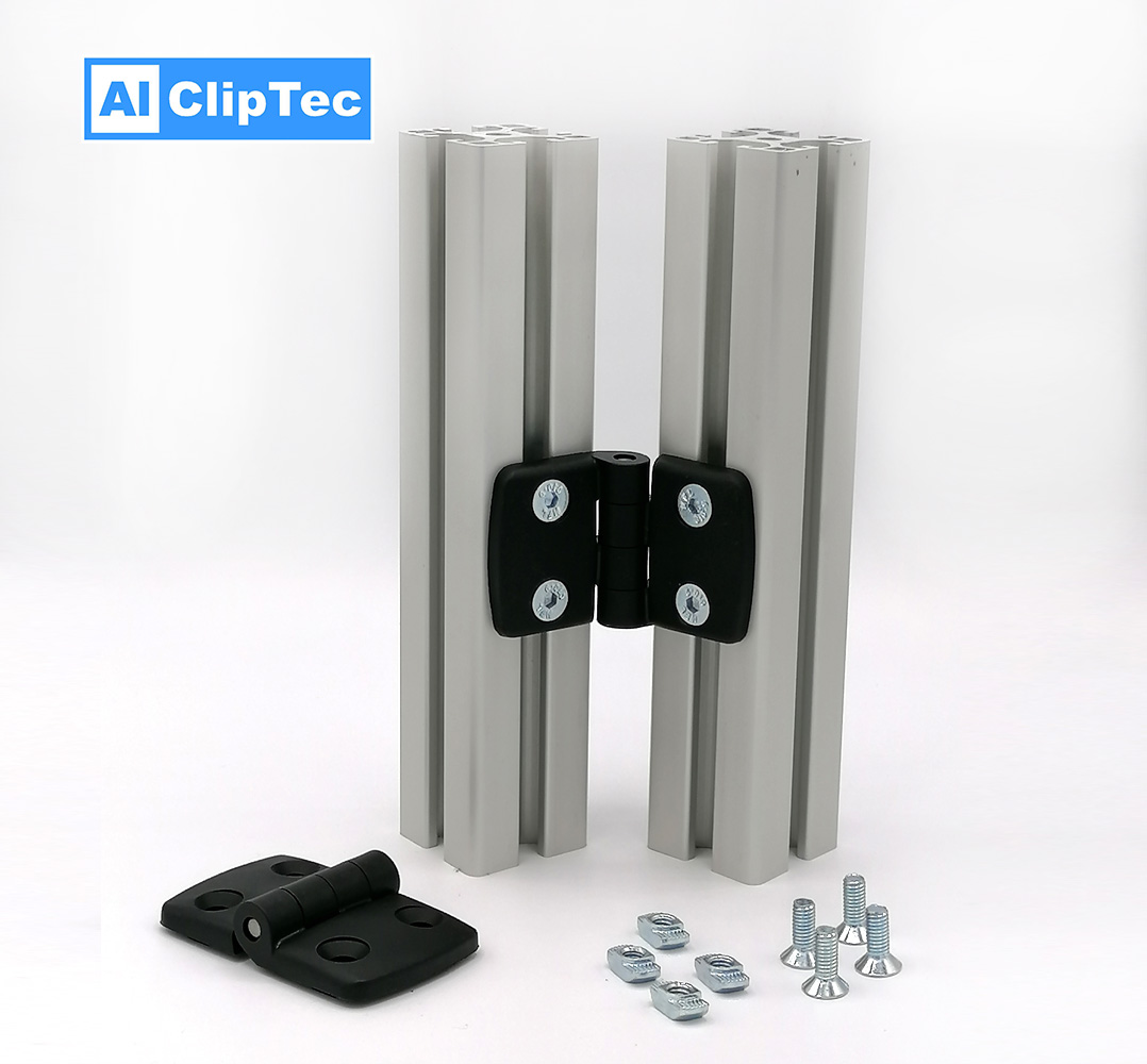 Nut 8 – I-Typ Kunststoff-Kombischarnier Nut 8 für 40er Raster Profil, Kunststoff inkl. Verschraubung