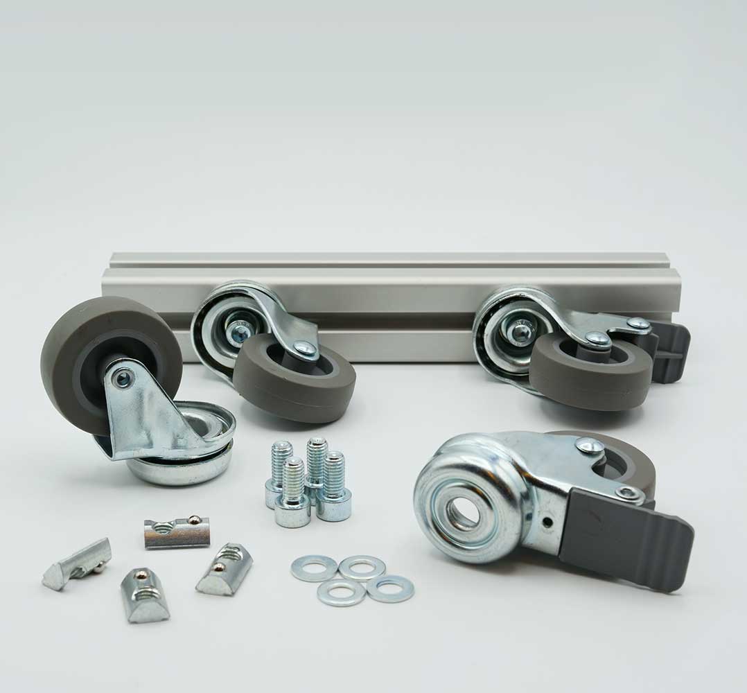 2 Lenkrollen mit Feststellbremse, 2 Lenkrollen ohne Feststellbremse und 4 Zylinderschrauben.