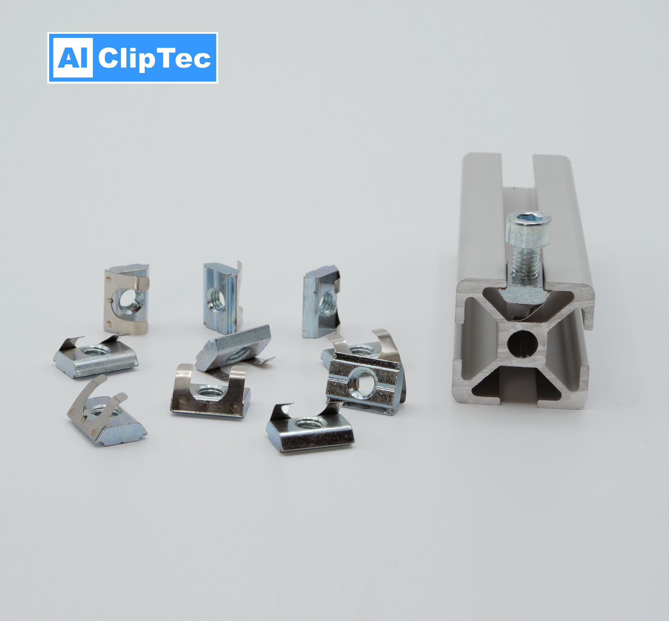 Einschwenkbarer Nutenstein mit Führungssteg und Federblech.