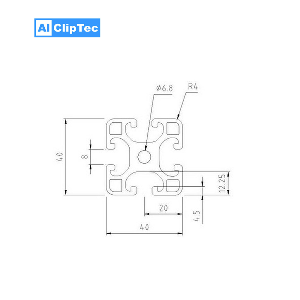 Unser Aluprofil AlClipTec 40×40 Nut 8 – I-Typ, hat 4 offene Nuten. Es ist unser meistverkauftes Profil, da es vielseitig und flexibel einsetzbar ist. Dieses robuste Konstruktionsprofil ist bestens geeignet für stabile Projekte wie Maschinenumhausungen, Vitrinen und Montageflächen.